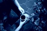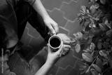 chica joven tomando café en la terraza junto a planta verde