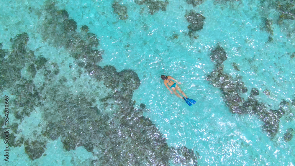 TOP DOWN: Flying above a tourist girl snorkeling around the decaying reef.