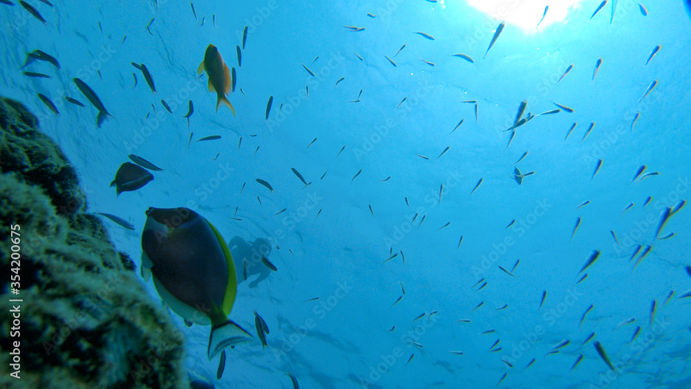 UNDERWATER: Beautiful view of colorful tropical fish swimming near coral reef