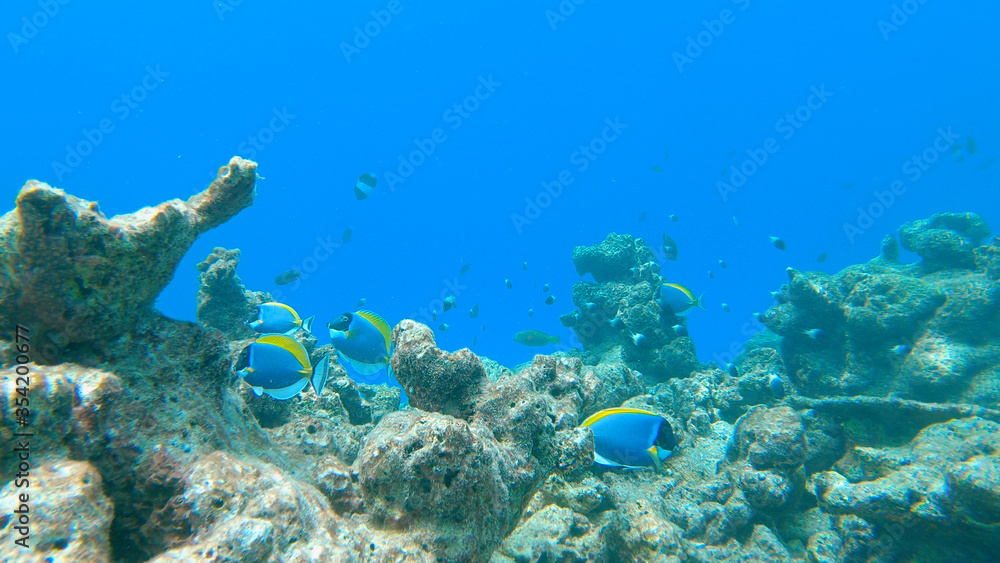 UNDERWATER: Bright summer sun shines on exotic species of fish near a coral reef