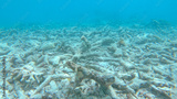 CLOSE UP: Sad view of a devastated bleached exotic coral reef in the Maldives.