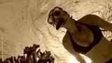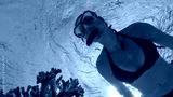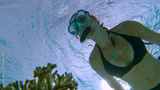 UNDERWATER: Young Caucasian woman in black bikini snorkels past a bleached coral