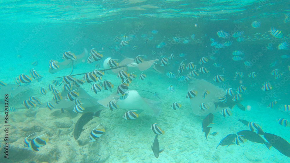 UNDERWATER: Stunning stingrays swim with a shoal of colorful tropical fish.