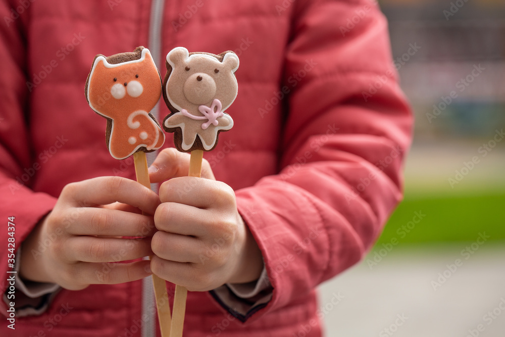 Cute sweets on the sticks, hold by little girl. Candy bear and cat.