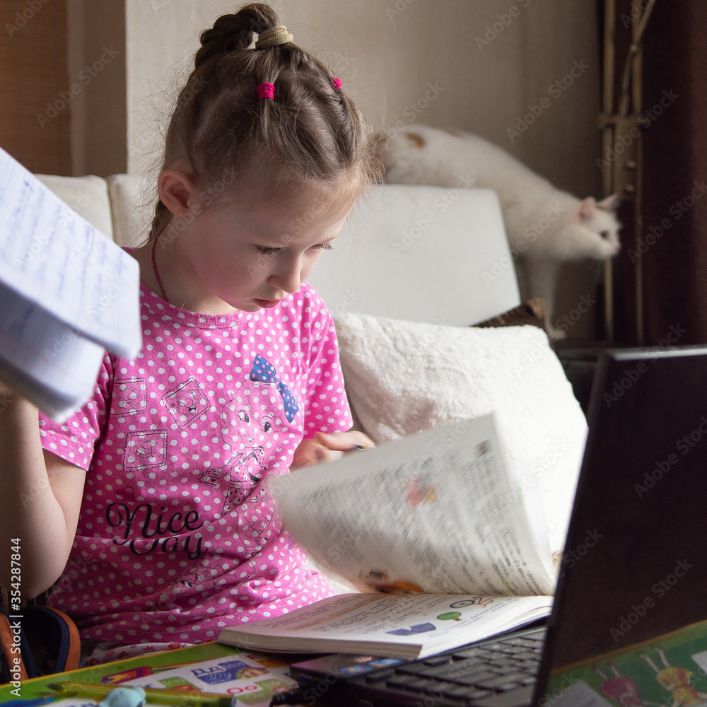 Distance learning online education. Schoolgirl studying at home with laptop and doing school homework. Coronavirus concept