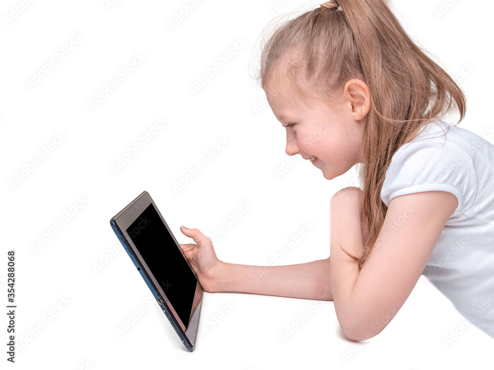 cute Little girl using Tablet PC at home. Education, science, technology, children concept