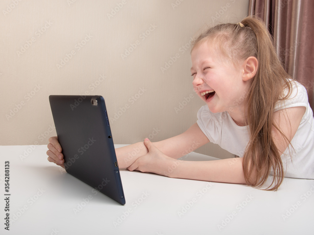 cute Little girl laughing looking at tablet PC at home, remote communication children concept