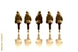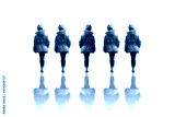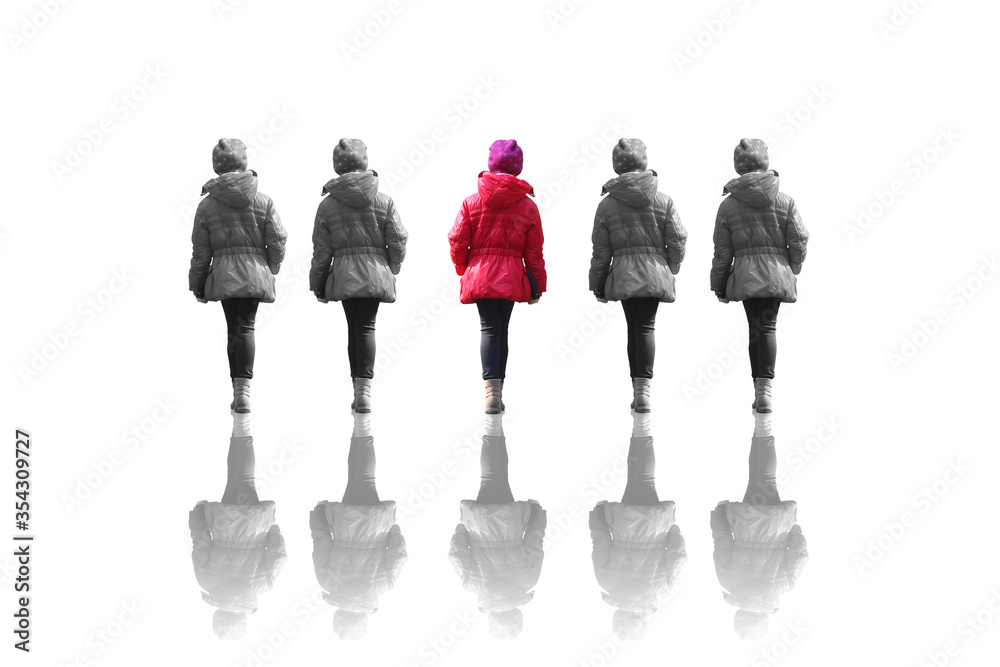 Abstract photo of girl in red jacket from back between black and white images of same girl isolated on white background