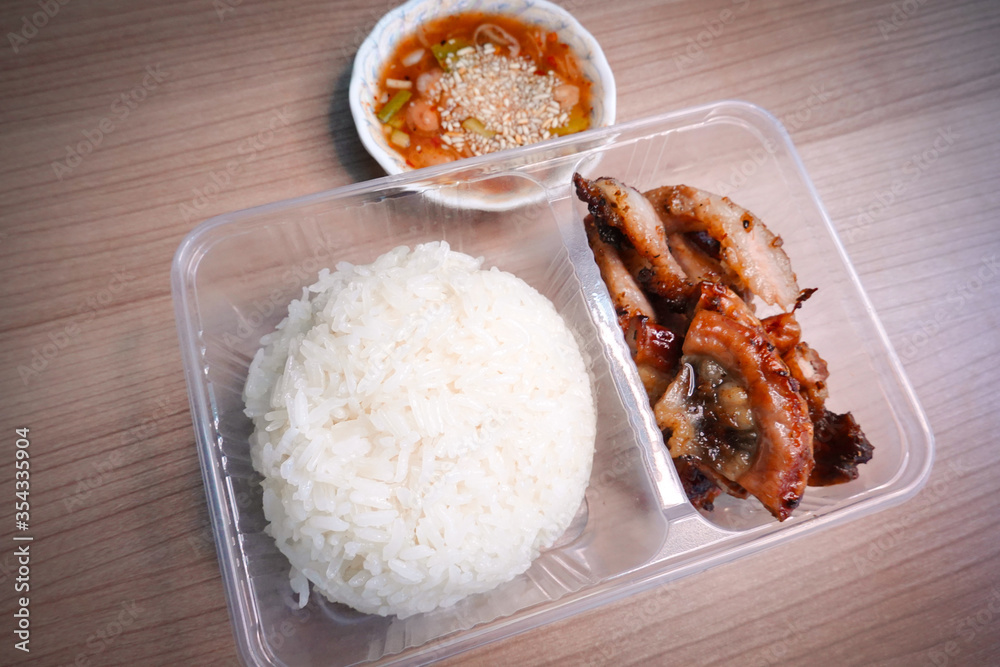 traditional Thai culture fried pork neck grilled intestines Chitterlings cuisine air fryer or moo tod yang box set famous street fast foods menu at thailand hot spicy sauces on wood sticky rice