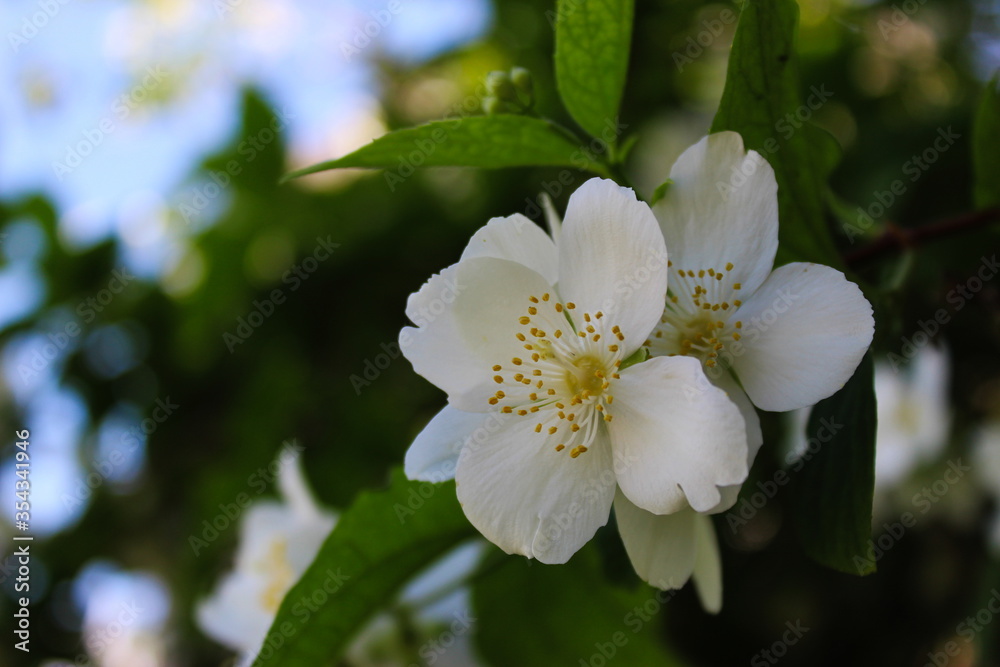 Amazing white flowers with four petals with a dark background. Philadelphus coronarius, sweet mock-orange, English dogwood.