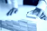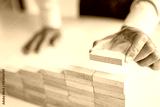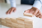 Close up of hand holding small wooden brick put on the wall, Risk and solution.