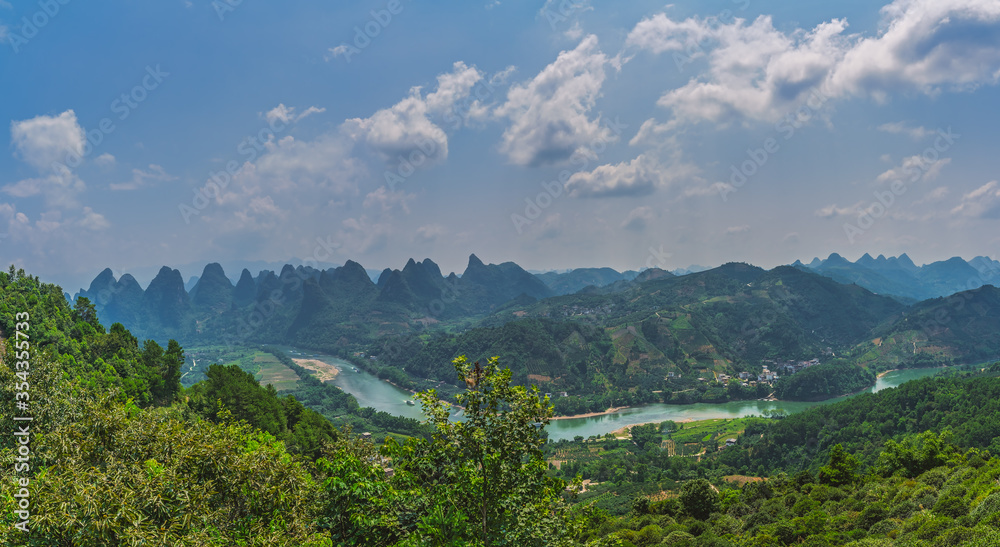 Xianggong Hill viewpoint panorama of beautiful green, lush and dense karst mountain landscape in Yangshuo, Guangxi Province, China