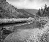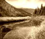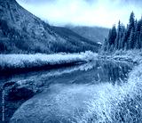 Pristine river leading through cloudy valley, shot on Mount Smutwood trail in Kananaskis, Alberta, Canada