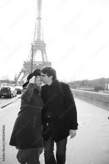 man and woman walking in Paris on Eiffel tower. romantic trip in spring France.