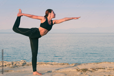 European woman practicing fitness yoga workout on the coast at sunset. Training on sea and mountains background. Concept of a healthy lifestyle and individual outdoor sports while social distancing.