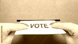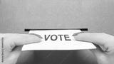Unrecognizable woman putting a ballot list into a voting box, point of view.