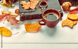 Cup coffee with book in leather binding autumn dry leaf and warm scarf on white wooden board top view.