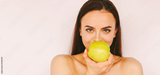 Portrait beautiful young girl posing with green apple in hand, smile isolated on white background. Attractive happy healthy woman eat apple fruit. Stomatology, dental treatment, oral care, dentistry