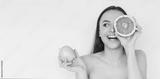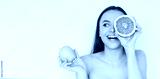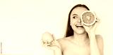 Portrait young happy girl have fun and posing with green apple and grapefruit isolated on white background. Beautiful funny woman hold healthy fruits in hands and smile. Beauty, cosmetology, diet