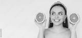Portrait cheerful beautiful woman posing with grapefruit slices in hands isolated on white background. Young happy girl have fun, hold healthy citrus fruits in hands. Copy space, beauty, fashion, diet