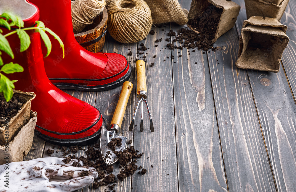 Gardening tools with soil red boots and seedlings tomato on wooden board in rustic style. Copyspace top view.