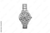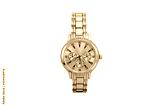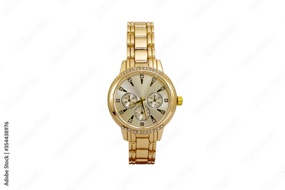 Gold colored chronograph wristwatch with metal oyster bracelet and yellow dial face isolated on white background.