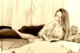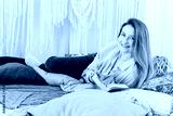 Young pretty woman is reading a book at home in bed. House reading concept, bright interior