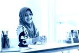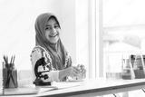 Cute Muslim girl wear hijab enjoys learning science, looking at camera with joyful