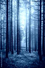 Foggy morning in piny forest with green grass and high tree trunks. Forests sunrise landscape with shining sunlight rays throw pine trees crowns.