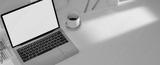 Simple worktable with mock-up laptop, coffee cup, oil pastels and copy space on white desk
