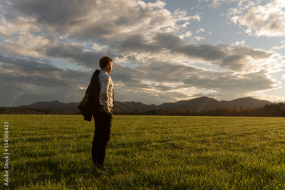 Young businessman standing in green meadow gazing into the distance