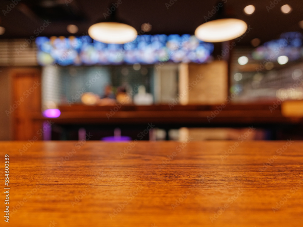 Table top wooden counter Bar Restaurant lighting Blur background