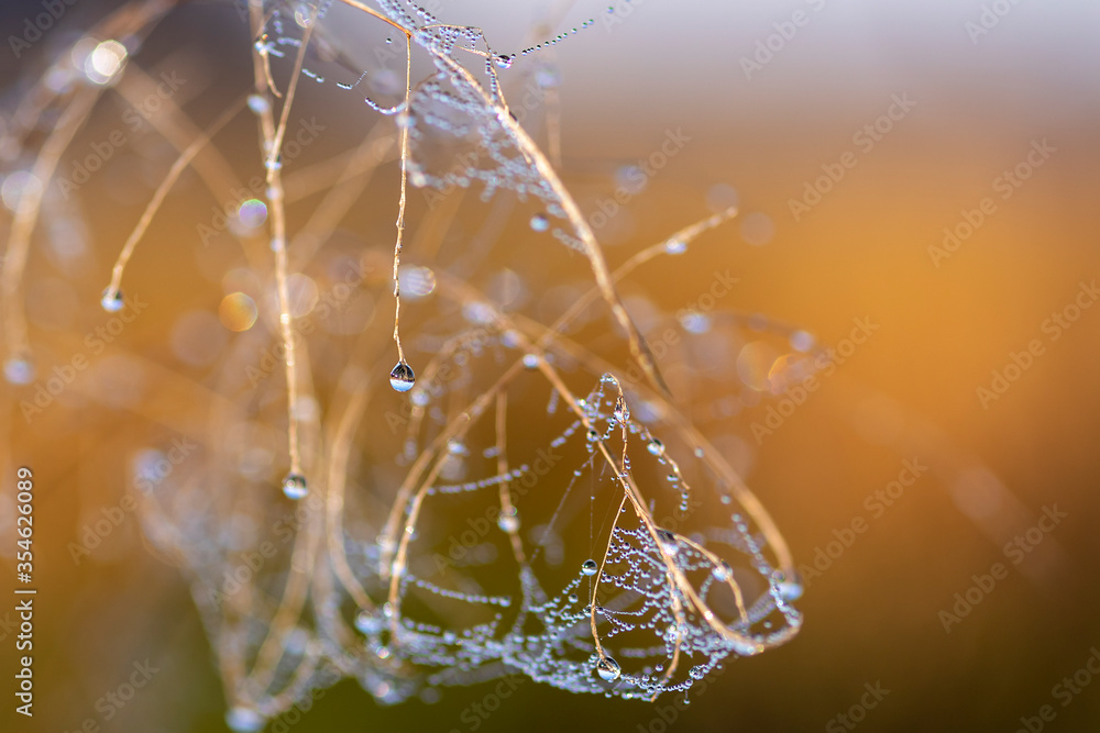 Closeup of a wet cobweb with morning dew. Water drops with reflection of the surroundings, macro, blurred background