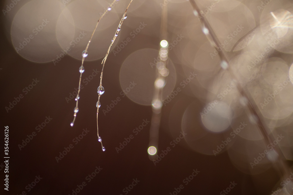 Close-up of plant on a sunny morning. Dew, macro, blurred background