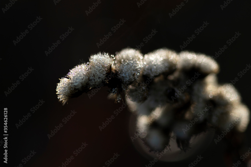 Close-up of blooming flowers on a sunny morning. Dew, macro, blurred background