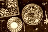 Umm Ali on table with nuts and milk. Oriental dessert with Egyptian bread and chopped nuts on table next to cup of milk and box with almonds, star anise, hazelnuts and pistachio.