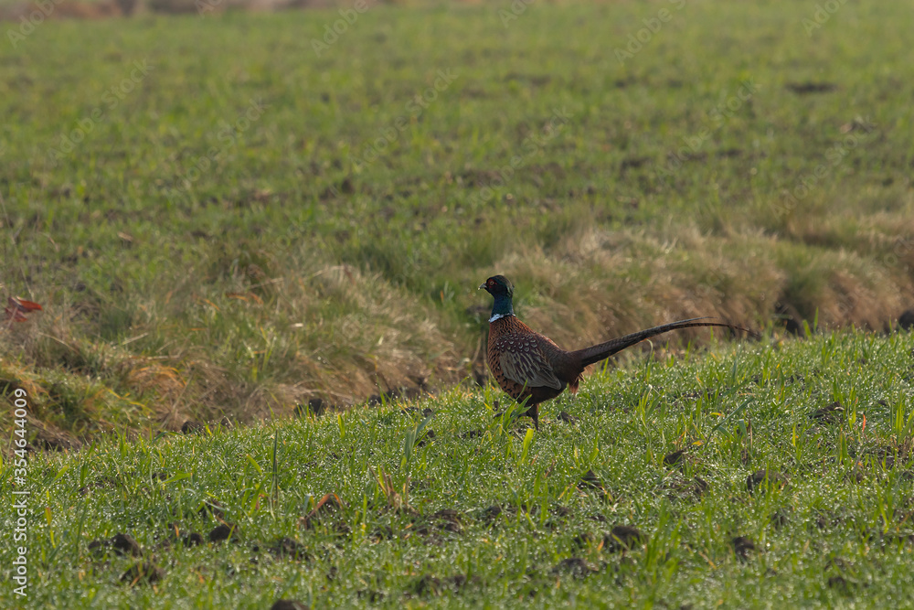 A male of the Common Pheasant (Phasianus colchicus) walks through the meadow in the morning