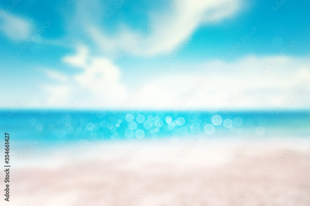 Blur tropical sand sea sky and beach with bokeh sun light and sky with clouds summer vacation background concept