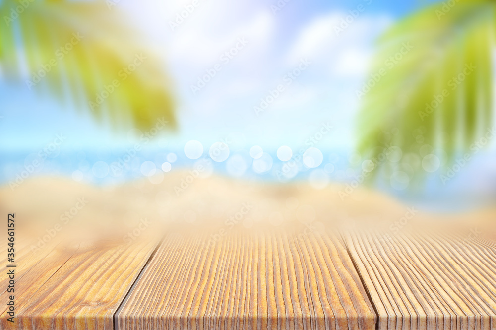 Empty wooden table over blurred sea sand sun sky and coconut palm leaves bakcground, Summer concept montage product display