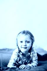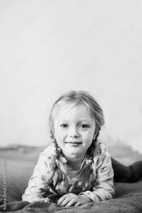 A smiling little girl with blond hair lies on the bed at home and looks at the camera.