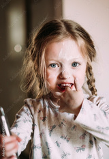Happy little girl child stands in the kitchen close-up portrait with flour on face.