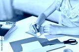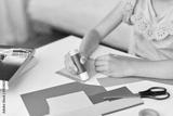 childhood, creativity and hobby concept - close up of creative girl making greeting card and sticking paper stripe with glue stick at home