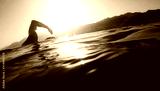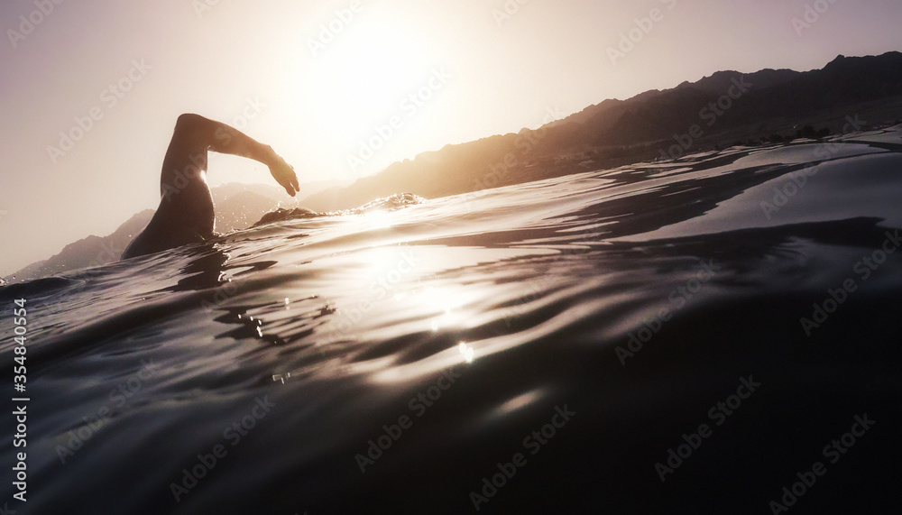 Athletic young man swimming at sea. Professional triathlon swimmer in water