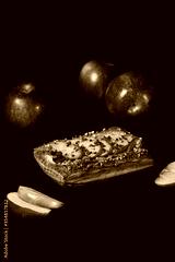 Still life with strudel and red apples on a dark background
