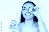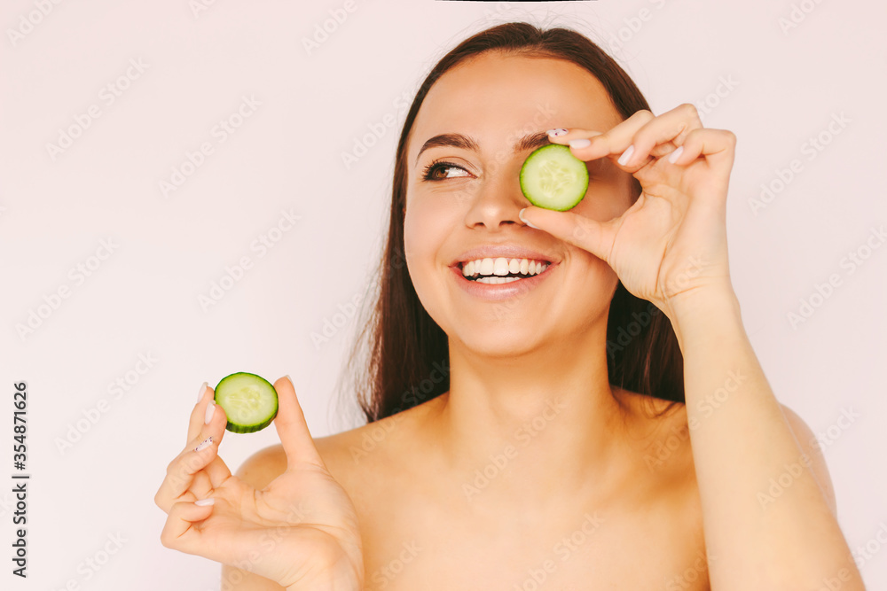 Portrait young happy woman beauty model posing with cucumber slices on face, smile isolated on white background. Beautiful girl with perfect skin hold cucumber in hands. Beauty treatment, cosmetology