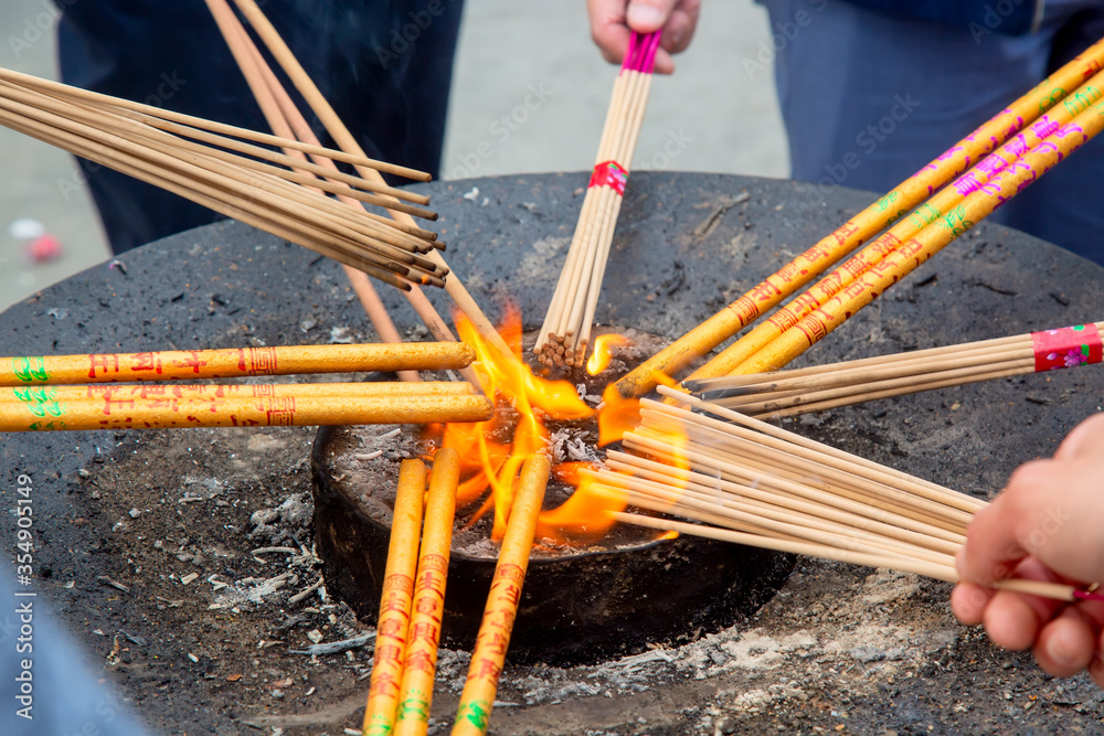 Closeup view of people burning incense sticks at the Buddhist Jing'an temple in Shanghai, China