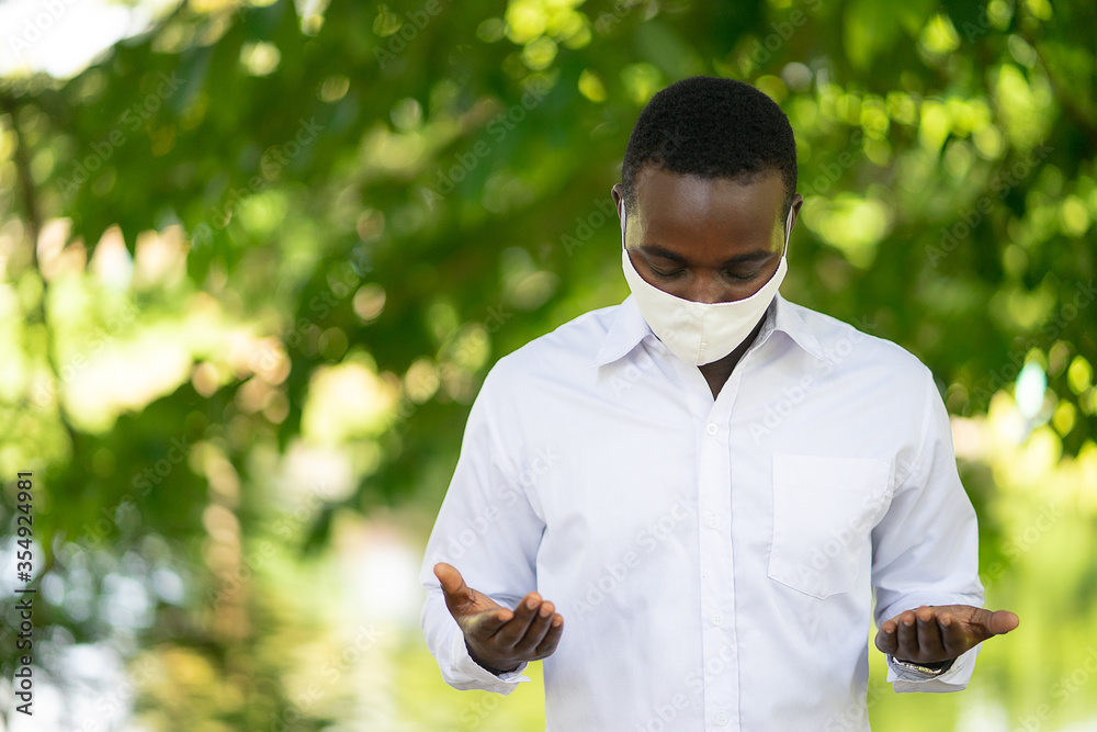 African man wear white shirt and face mask for virus protection with text Pray for the World corona virus covid-19 on green nature background