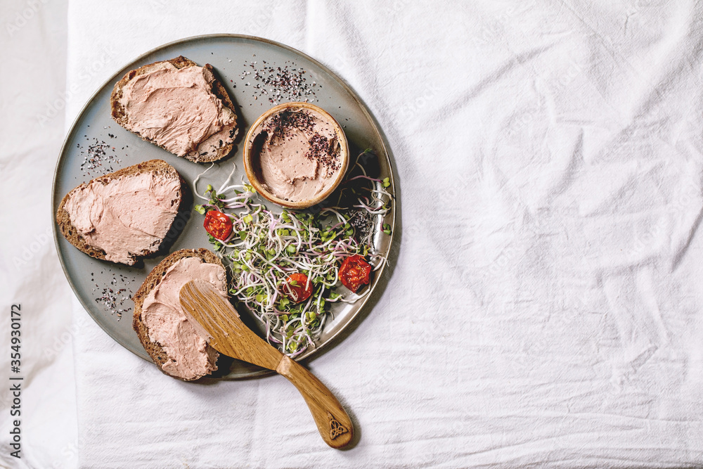 Sandwiches and ceramic bowl of homemade chicken liver pate with wooden knife, sun-dried tomatoes and green sprout salad on gray plate over white linen table cloth. Flat lay, space