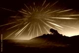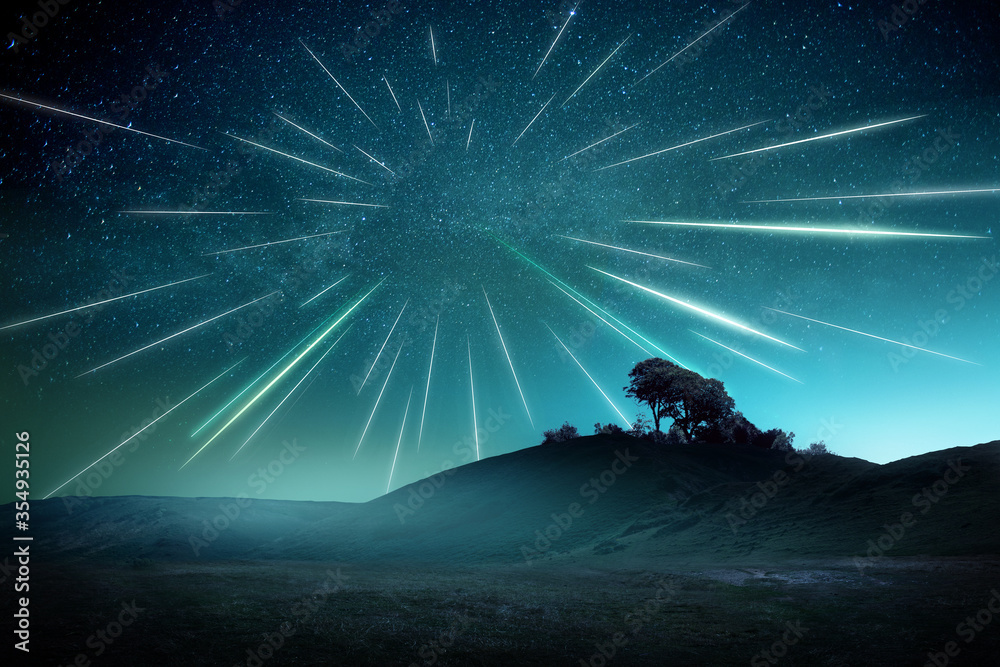 A large meteor shower on a misty evening with streaks across the sky. Shooting stars landscape astrophotography composite.