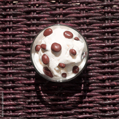 Top view of bowl of vanilla ice cream with chocolate covered raisins